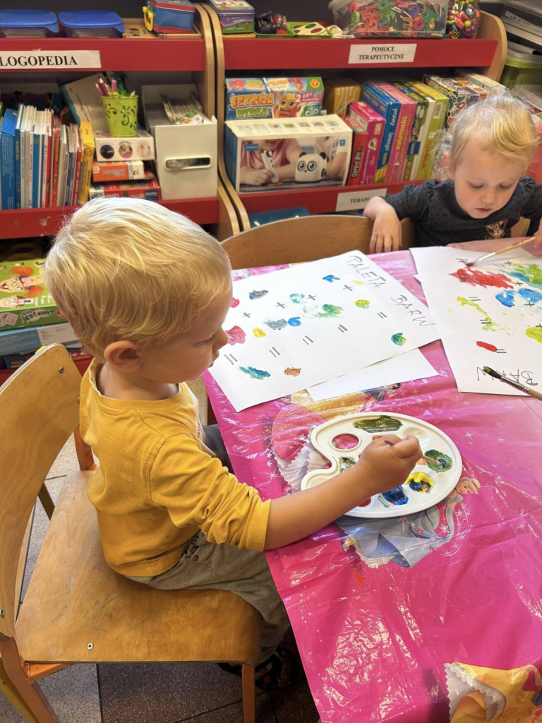 Przedszkolaki eksperymentowały z farbami, tworząc własną paletę barw.