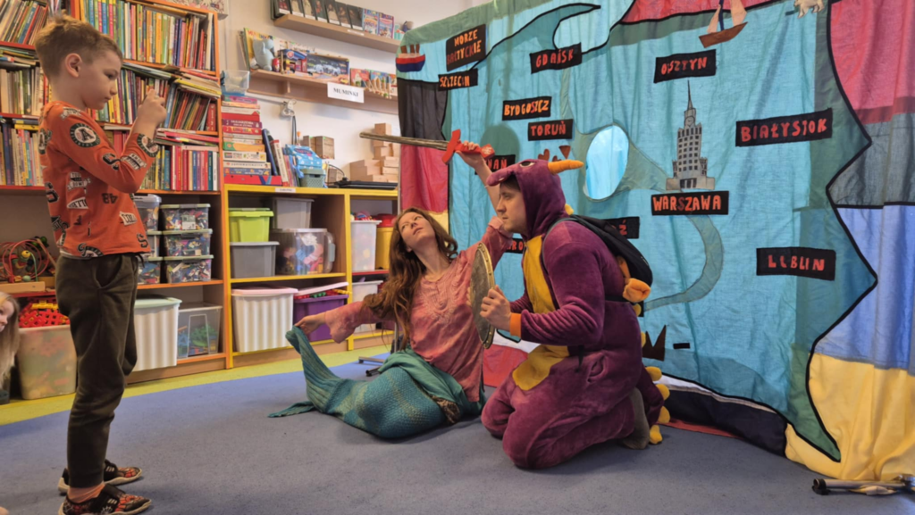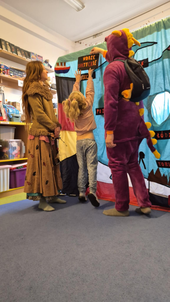 Aktorzy Anna Marciniszyn i Adam Krawczyk ze Studia Artystycznego AKADA zachwycili nas swoją grą, zabierając dzieci w pełną przygód opowieść. Maluchy z ogromnym zainteresowaniem śledziły losy bohaterów, poznając polskie tradycje, kulturę i niezwykłe miejsca.